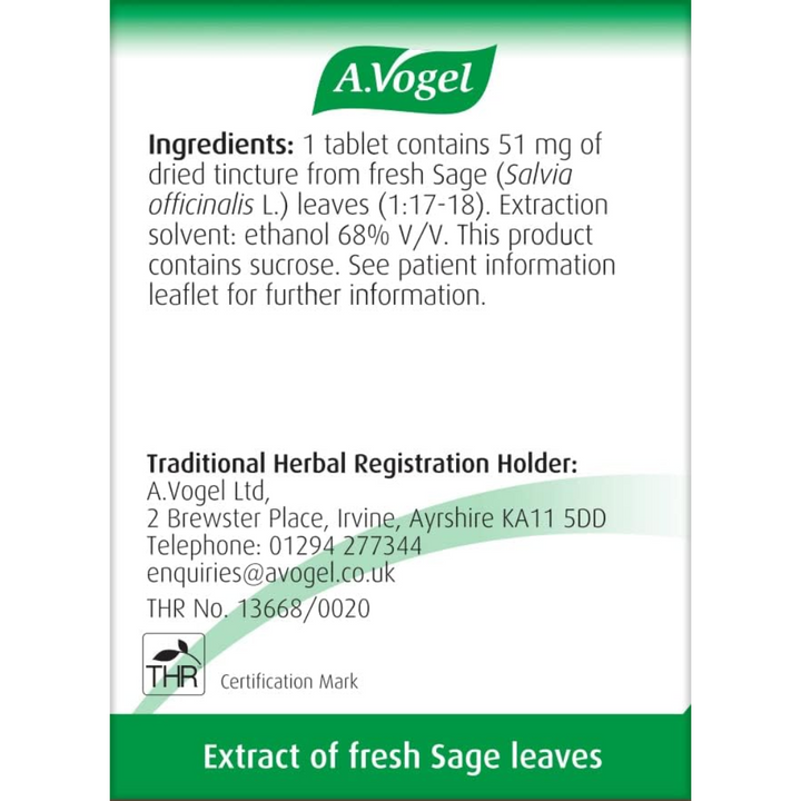 Active Ingredient: 1 tablet contains 51 mg of dried tincture from fresh Sage (Salvia officinalis L.) leaves (1:17-18). Extraction solvent: ethanol 68% V/V.