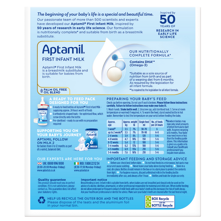 NOTICE: Breastfeeding is best. Aptamil Infant milk should only be used on the advice of a doctor, dietitian, pharmacist, or other professional responsible for maternal and child care. Do not allow prolonged or frequent contact of drinks with your child's teeth as this increases the risk of tooth decay. Ask your healthcare professional or dentist for advice.