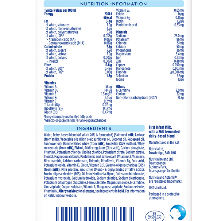 Ingredients: Water, Dairy-based Blend (of Which 26% is Fermented) [Skimmed MILK, Lactose (from MILK), Vegetable Oils (High Oleic Sunflower Oil, Coconut Oil, Rapeseed Oil, Sunflower Oil), Demineralised Whey (from MILK), Emulsifier (SOY Lecithin), Whey Concentrate (from MILK), FISH Oil, Acidity Regulator (Citric Acid), Calcium Phosphate, Vitamin C, Potassium Chloride, Choline Chloride, Potassium Citrate, Sodium Citrate, Inositol, Magnesium Chloride, Pantothenic Acid, Antioxidant (Vitamin C), Vitamin E, Nicotinamide, Calcium Carbonate, Thiamin, Riboflavin, Vitamin B6, Folic Acid, Potassium Iodide, Vitamin K₁, Biotin, Vitamin B12], Galacto-Oligosaccharides (GOS) (from MILK), MILK Protein, Emulsifier (Mono- & Diglycerides of Fatty Acids), Fructo-Oligosaccharides (FOS), Oil From Mortierella Alpina, Potassium Bicarbonate, Potassium Hydroxide, Calcium Hydroxide, Sodium Chloride, Sodium Bicarbonate, Potassium Dihydrogen Phosphate, Ferrous Lactate, Magnesium Oxide, L-Carnitine, Zinc Sulphate, Copper Sulphate, Vitamin A, Manganese Sulphate, Sodium Selenite, Vitamin D3