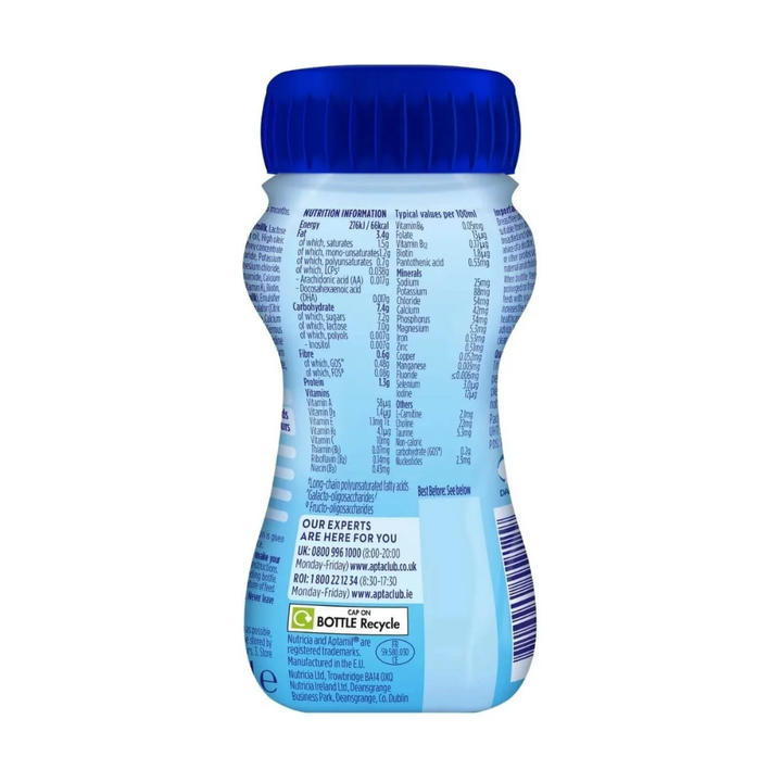 Aptamil First Milk 200ml RTF offers an unique blend of ingredients specially tailored to nutritionally support your baby at its first stage of development. Aptamil First Infant Milk From Birth is a nutritionally complete breastmilk substitute, allowing you the option of combination feeding. Ready to use in a handy screw cap bottle, it is perfectly practical, making feeding times easy and with less fuss.