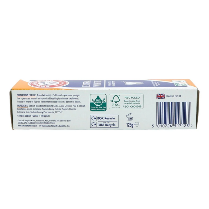 Arm and Hammer Extra White care toothpaste 125g is used to help clean teeth, protect them from cavity. Arm and Hammer Extra White Care 125g is also used to help freshen breath, control tartar and whiten teeth.