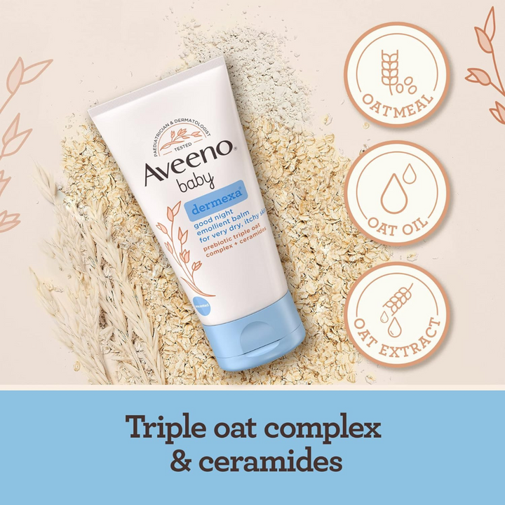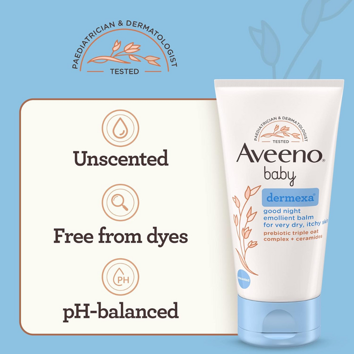 AVEENO® Baby Dermexa Good Night Emollient Balm provides immediate and long-lasting moisture through the night and soothes dry skin reducing itchy sensations, so your little one can sleep well.