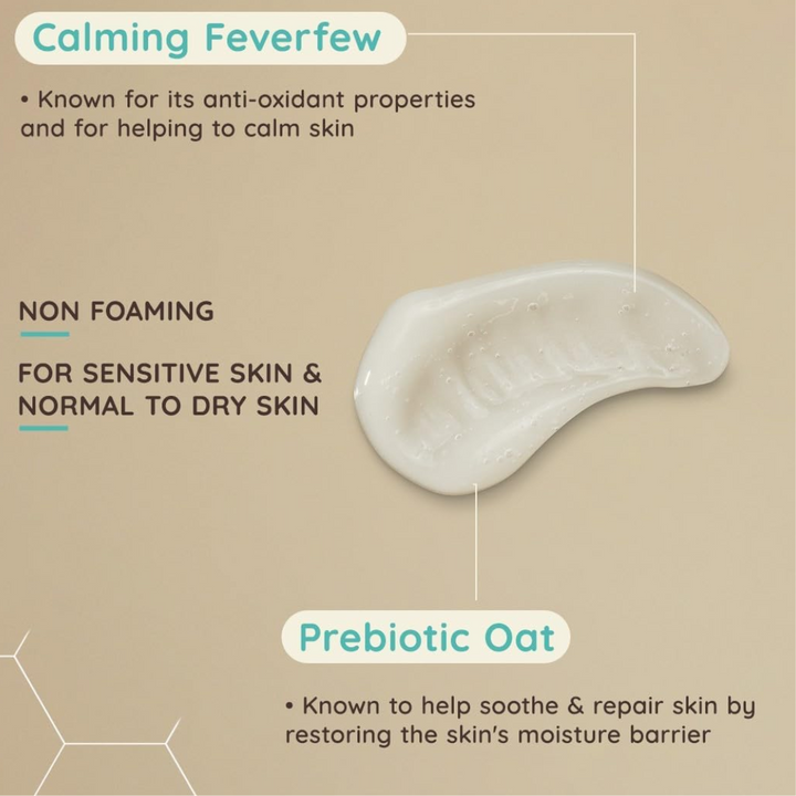 The Nourishing Oat Cleanser is formulated with Prebiotic Oat, known to help soothe and repair the skin by restoring its moisture barrier, and Calming Feverfew, known for its antioxidant properties and for helping to calm the skin.