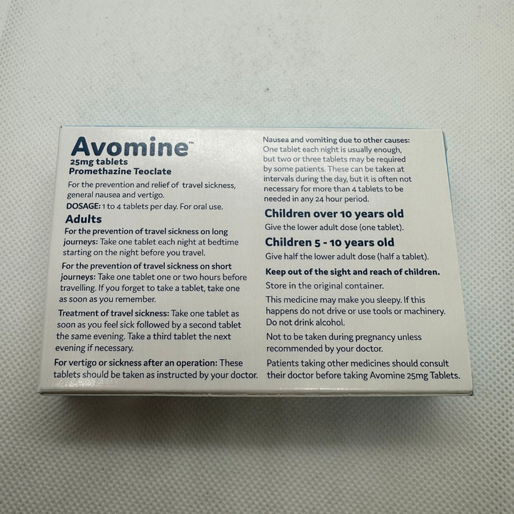 Avomine Tablets 25mg, 10 TabletsAvomine Tablets 25mg contains the active ingredient Promethazine theoclate, which is an antihistamine mostly used for preventing travel sickness and nausea. It can also be used in the treatment and prevention of: