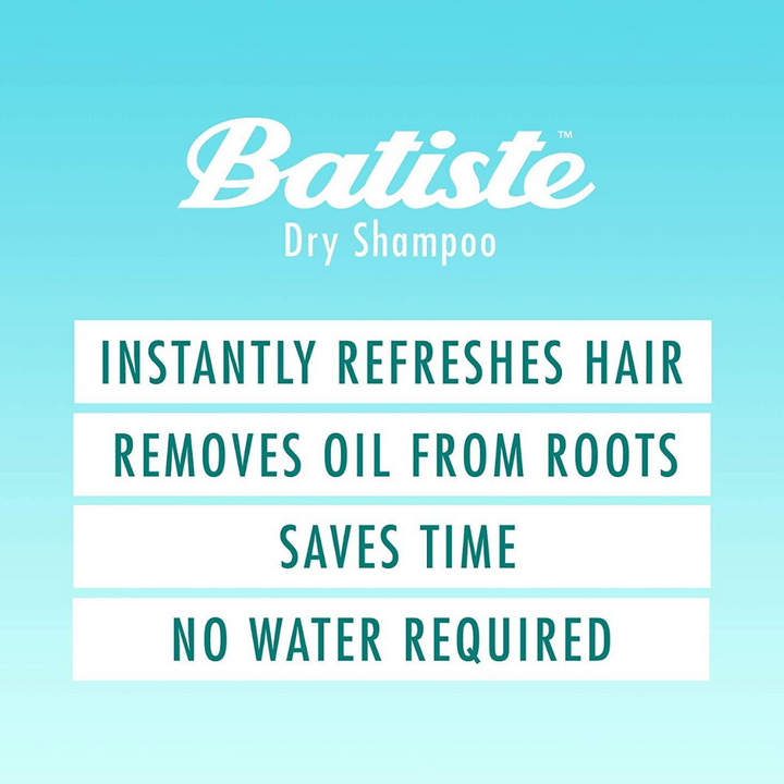 Batiste Dry Shampoo, the in-between shampoo - perfect for hair that feels greasy and lifeless between washes. Quick and convenient to use at home or on the move. Leaves hair feeling clean, fragrant and full of body. Batiste Dry Shampoo Hair Benefits in Damage Control (200ml). Feeling frazzled? This breakthrough formula, with strengthening keratin, will refresh hair and help protect it against damage caused by heat styling and over-processing - leaving it looking healthy and feeling fab. Works on any hair type, but it’s ideal for dry, damaged hair. Batiste Dry Shampoo instantly refreshes your hair when you don't have time (or the energy!) for a full on get ready session. Spray in the morning when you want to sleep in, at your desk for a midday boost, or take Batiste with you to the gym, on holiday, and beyond. It instantly absorbs oil from the scalp, revitalises dull and lifeless hair and helps to eliminate odour – leaving you with fabulously fresh-looking hair in a moment. Directions: A few easy steps to game-changing hair. First, shake the bottle vigorously. Section hair and hold the nozzle about 12 inches away as you spray. Leave in a few moments, then massage into the scalp with fingertips to distribute evenly. For maximum damage protection spray all over and work through. • Batiste Dry Shampoo in Damage Control (200ml) spray • Safe for use on coloured hair • Suitable for hair types that become oily in between washes • Sulfate & sodium free – safe to use on keratin treated hair Batiste products are safe to use across the hair colour spectrum! And by washing your hair less, you can help extend your hair colour. White residue is a perfectly normal part of the dry shampoo process and will disappear quickly. To help reduce the amount of whiteness shake the can well, spray 12 inches from roots, massage thoroughly and brush away excess residue. Live like nobody’s washing! No time to wash your hair? Batiste Dry Shampoo is an innovative formula that boosts body and helps eliminate oily roots, giving dull lifeless hair an instant makeover without water. A quick spray revitalises hair leaving it looking and feeling clean, no drama.