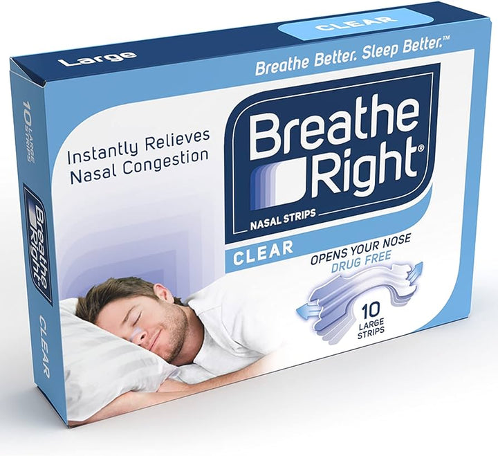 Breathe Right Nasal Strip Clear Large 10 stripsBreathe Right® Clear Nasal Strips are designed to help instantly relieve nasal congestion and stuffiness caused by colds and allergies, helping you to breathe more easily during the day and while you’re asleep – without any medication.