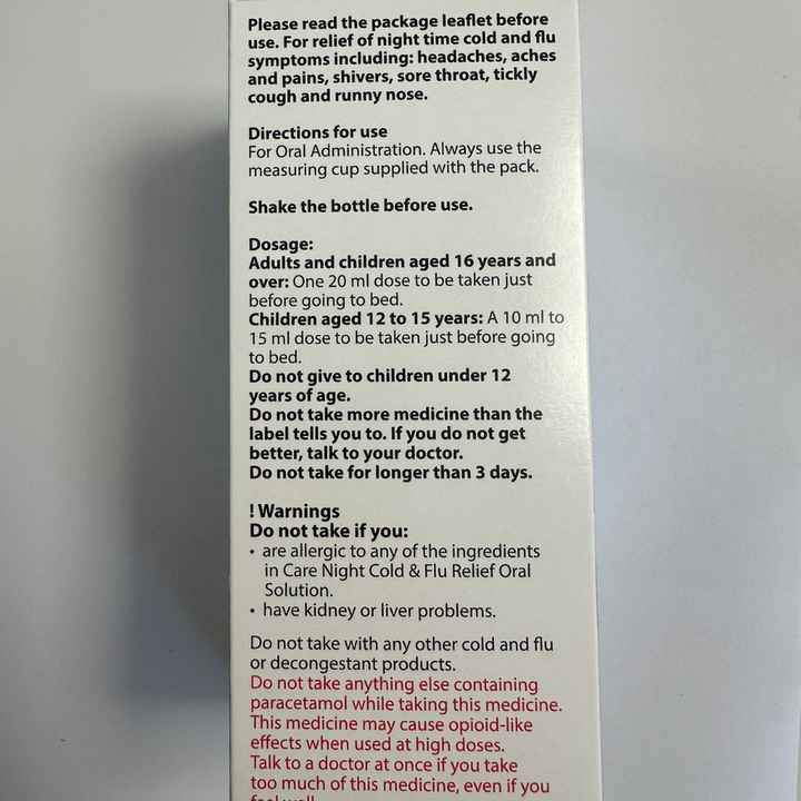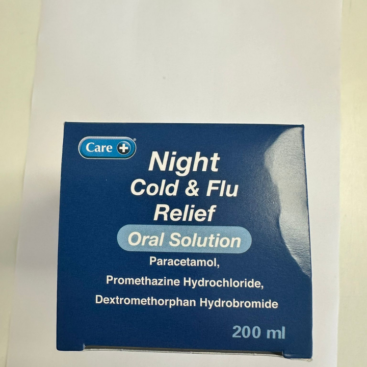 Care night oral solution provides effective, night-time relief from common cold and flu symptoms, such as headaches, shivers, runny nose, tickly cough, aches and pains