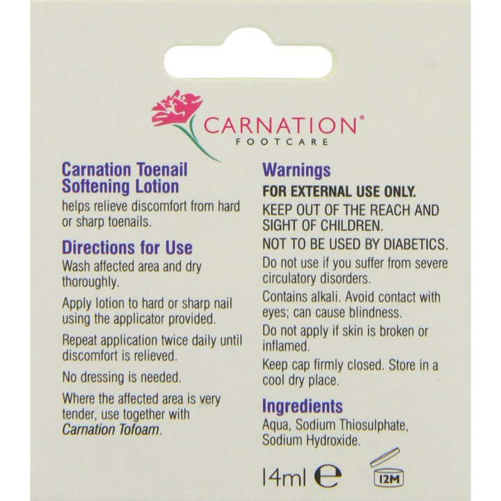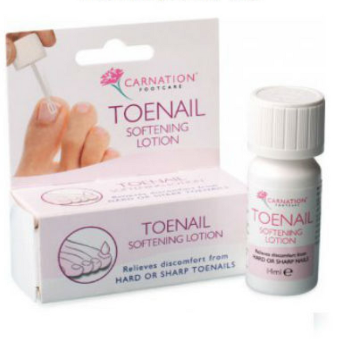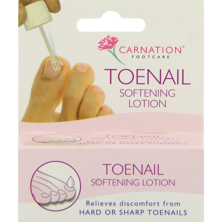 Carnation Toenail Softening Lotion helps to relieve discomfort from hard or sharp toenails.