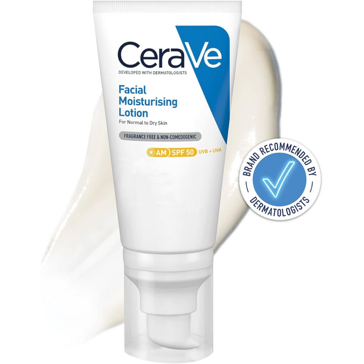 A daily lightweight facial moisturiser with SPF 50+ UVB/UVA protection and 3 essential ceramides, leaves skin feeling soothed, and hydrated for up to 24 hours, while protecting the skin’s natural barrier. ▪ Developed with dermatologists, CeraVe AM Facial Moisturising Lotion SPF50+ is suitable for normal to dry skin on the face. Also suitable for acne-prone skin. ▪ With 3 essential ceramides and SPF50+, the gentle formula contains broad spectrum protection to defend the skin barrier against UVA & UVB rays that deplete ceramides. The fast-absorbing moisturiser also helps protect the skin against pollution particles. ▪ Powered by CeraVe’s patented delivery system, MVE technology, the lightweight lotion offers a continuous release of moisturising ingredients throughout the day, providing up to 24-hour hydration. Skin feels calm and hydrated, and looks balanced. ▪ Non-comedogenic. Fragrance free. Non-greasy texture. ▪ For your daily facial routine, firstly cleanse with CeraVe Hydrating Cleanser for normal to dry skin, or CeraVe Foaming Cleanser for normal to oily skin. Secondly, give your skin a hydration boost with CeraVe Hydrating Hyaluronic Acid Serum, and finally finish with CeraVe AM Facial Moisturising Lotion SPF50+ to hydrate while protecting the skin from daily aggressors. ▪ It also contains Vitamin E and Niacinamide, and leaves skin soothed and hydrated.