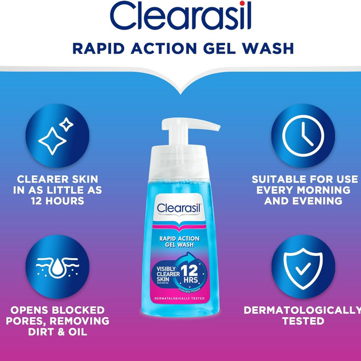 Clearasil Gel Wash is proven to work with your skin to open blocked pores for visibly clearer skin in as fast as 12 hours, so you can get on with your day with confidence.