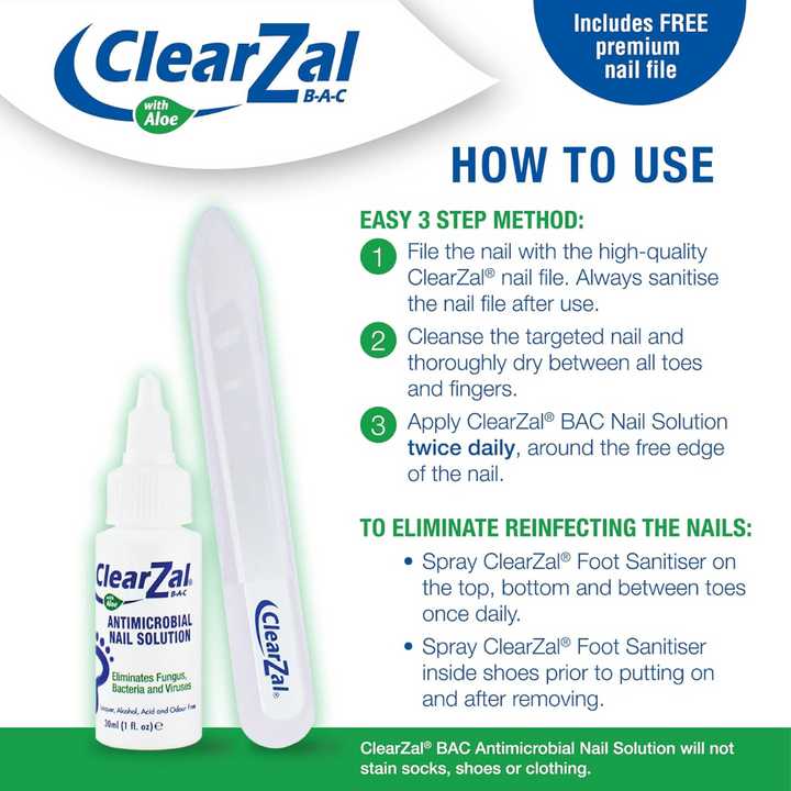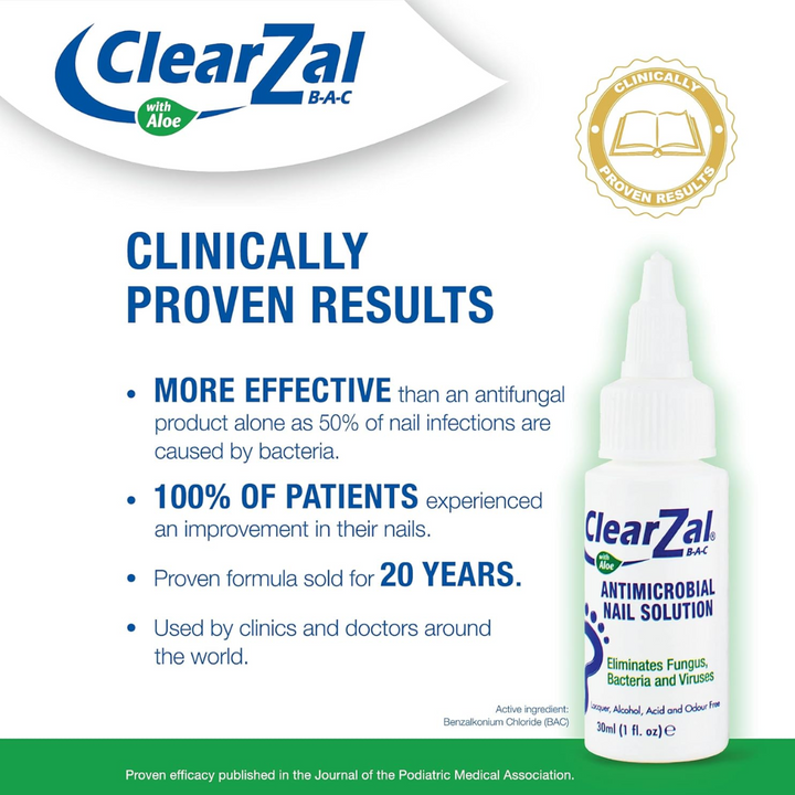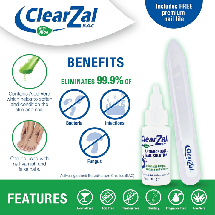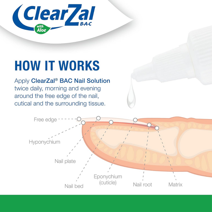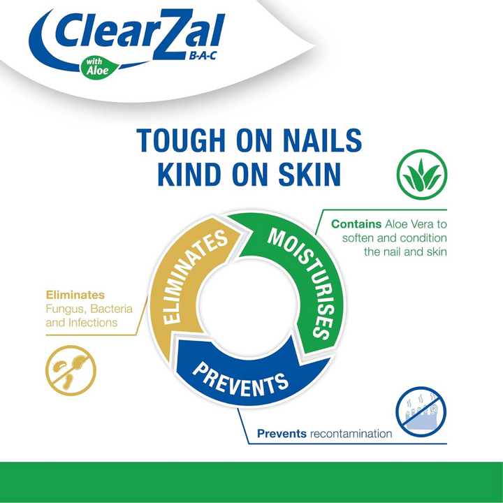 ClearZal BAC is a cost-effective topical solution which kills the fungus, bacteria and viruses which may cause nail infections.