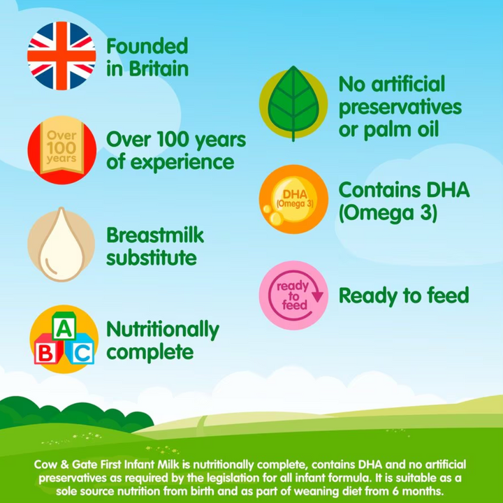 As required by legislation for all infant milk, Cow & Gate First Infant Milk contains DHA (omega-3), is nutritionally complete and suitable as a sole source of nutrition from birth and as part of a weaning diet from 6 months.