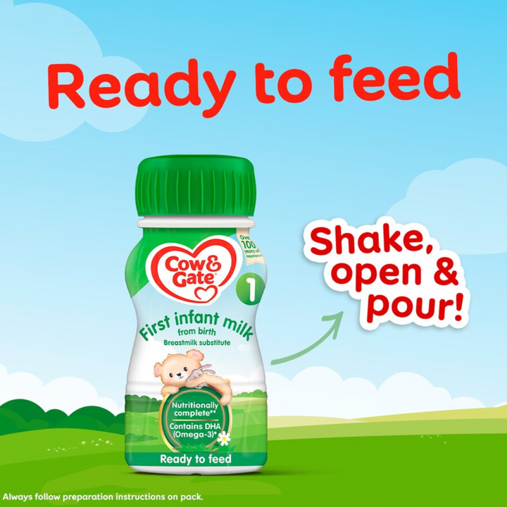 It’s a baby milk suitable from birth as a sole source of nutrition and it is suitable for combination and bottle-fed babies. Containing DHA (Omega-3) and no palm oil, Cow & Gate First Infant Milk comes in a ready to feed format in a 200ml bottle.