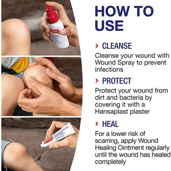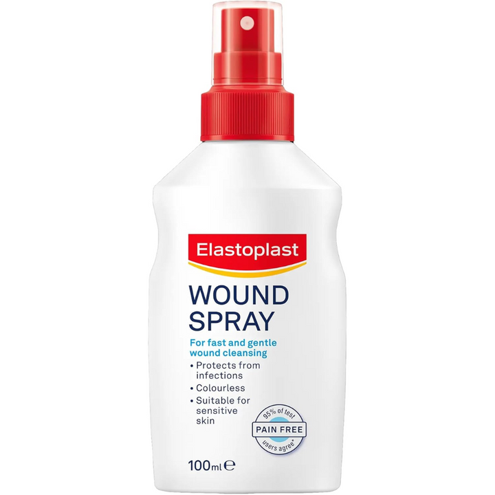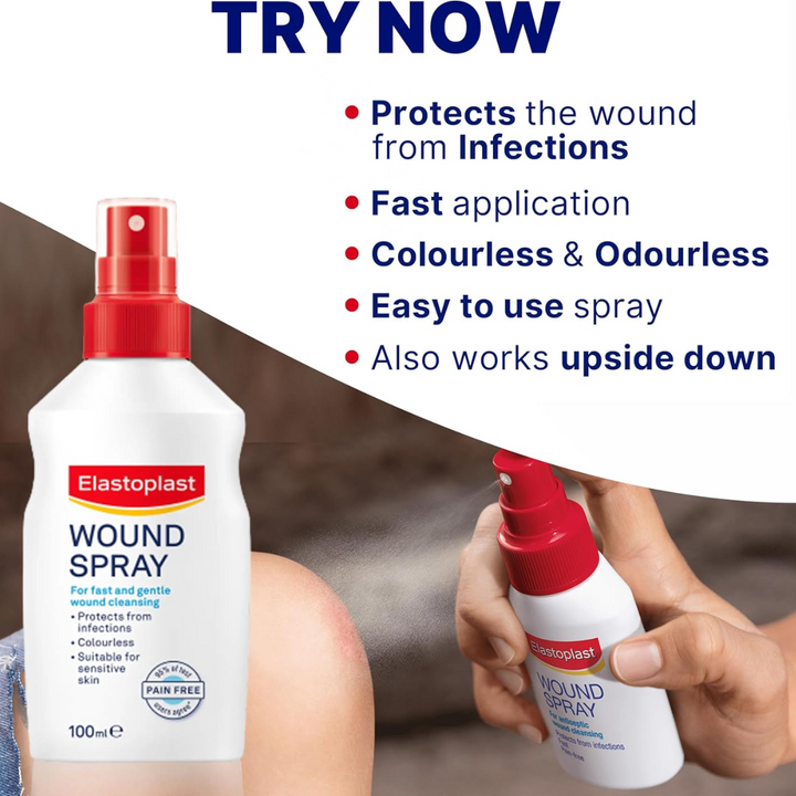 Elastoplast Wound spray for fast and pain free wound cleansing - 100Mlven superficial wounds can become infected if they're not cleansed effectively. Cleansing the wound is an essential first step for optimal healing and it is recommended for all types of wounds. Elastoplast Wound spray is an easy to use spray for the cleansing of minor acute wounds such as cuts, grazes, skin abrasions, first and minor second-degree burns and open blisters. It can also be used for chronic wounds and postoperative wound care as per your doctor's instructions. The Elastoplast Wound spray also helps to remove crusts or clotted dressings. It is free of alcohol and does not cause pain or stinging during application, or dry the skin. Elastoplast Wound spray is a pain-free and effective way to cleanse wounds from dirt and bacteria and prevent from wound infections.