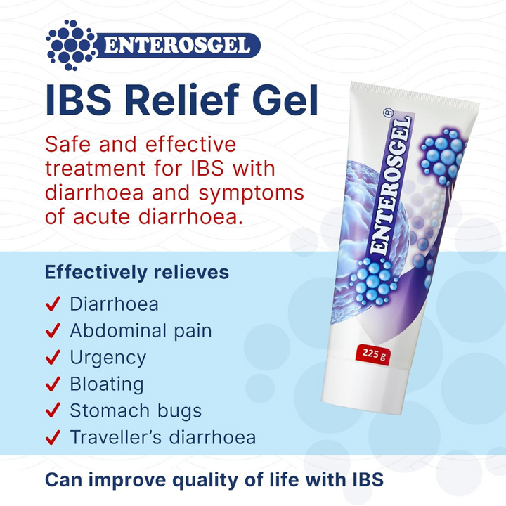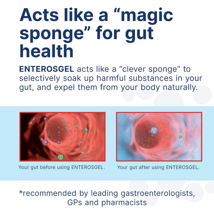 Enterosgel is indicated for the symptomatic treatment of acute diarrhoea and the treatment of Irritable bowel syndrome with diarrhoea. It captures some toxic and harmful substances in the gut (e.g. bacterial toxins), physically binding them to its surface, reducing stool frequency and duration of diarrhoea in acute or short term diarrhoea from gastroenteritis, tummy bugs or Traveller’s diarrhoea. Enterosgel relieves symptoms of diarrhoea, abdominal pain, bloating and urgency in IBS-D patients.