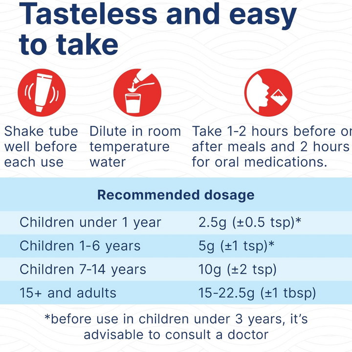 Under 1 years 2.5g ( 1/2 teaspoon) diluted in 7.5–15ml of water, 3 times a day. 1–6 years old 5g ( 1 teaspoon) diluted in 50–100ml of water, 3 times a day. 7–14 years old 10g ( 2 teaspoons) diluted in 50–100ml of water, 3 times a day. 15+ and adults (1tablespoon or 1 sachet) diluted in 200ml of water, 3 times a day. Duration of treatment; 3–5 days for acute diarrhoea and up to 30 days for IBS-D followed by a short break.