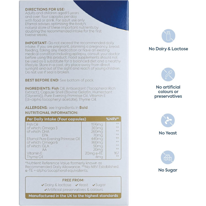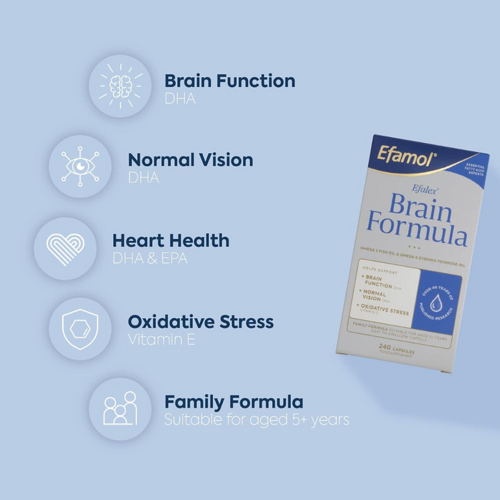 PREMIUM BRAIN & HEART HEALTH NUTRIENTS - Efalex Brain Formula is a unique blend of Fish Oil and Evening Primrose Oil including DHA and EPA (Omega 3 fatty acids) and GLA and AA (Omega 6 fatty acids). The omega 3 fatty acid DHA help keep brains functioning optimally, while DHA & EPA contribute to the normal function of the heart.