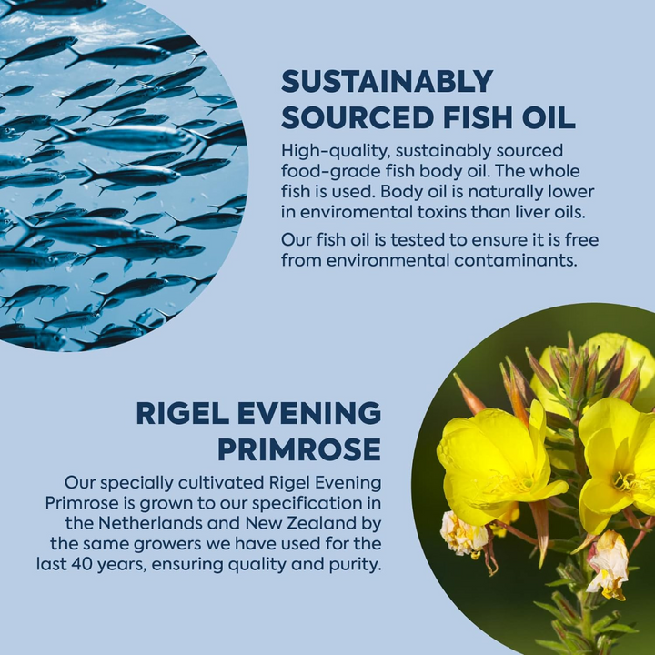 FISH OIL Antioxidant (Tocopherol Rich Extract), Capsule Shell (Bovine Gelatin, Humectant (Glycerol)), Pure Evening Primrose Oil, Vitamin E (dl-alpha tocopheryl acetate), Thyme Oil. Allergens: see ingredients in CAPITALS