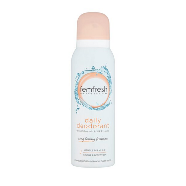 Femfresh™ daily deodorant for everyday use is gentle and specially formulated to give long lasting freshness in the intimate area. Formula contains MultiActif Complex and calendula extracts and will help you stay fresh and confident for longer. Also contains silk extract and provides a protective veil on the skin to feel comfortable even on your period days. Clinically tested under dermatological & gynaecological control.