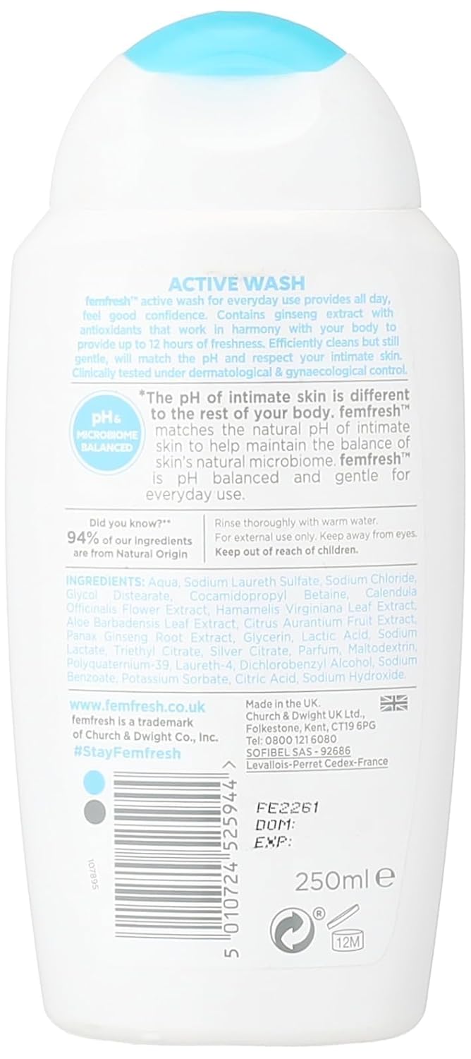 Stay confident and refreshed every day with Femfresh Active Wash. This bottle of daily intimate goodness keeps you feeling super-chilled, refreshed and energised for up to 12 hours. The feminine body wash is charged with silver-ion technology, ginseng extract and antioxidants; the ultimate multi-actif complex, to hydrate your intimate skin and give you that super fresh feeling all-day long. The pH-balanced formula is dermatologically and gynaecologically tested. It's also hypoallergenic and 100% soap free so it's gentle enough to use daily, every morning, or after a workout. Ideal for use on your vulva and vulval areas, Femfresh is specially designed to help maintain a healthy natural pH balance – to help reduce irritation and prevent itching and discomfort.. Femfresh Active vulva Wash – 250ml. With silver-ions & natural ginseng extract. pH balanced, soap free & fragrance free. Suitable for everyday use. Hypoallergenic. Dermatologically & gynaecologically tested. Simply later up & rinse thoroughly with warm water Ingredients: Aqua, Sodium Laureth Sulfate, Sodium Chloride, Glycol Distearate, Cocamidopropyl Betaine, Triethyl Citrate, Parfum, Glycerin, Laureth-4, Polyquaternium-39, Dichlorobenzyl Alcohol, Calendula Officinalis Flower Extract, Hamamelis Virginiana Leaf Extract, Panax Ginseng Root Extract, Citric Acid (and) Silver Citrate, 2-Bromo-2-Nitropropane-1,3-Diol, Sodium Benzoate, Lactic Acid, Sodium Lactate, Citrus Aurantium Fruit Extract, Sodium Carbonate, Sodium Hydroxide. Part of the Femfresh range. All products are specifically designed to care for women’s delicate vulval areas, to keep you feeling fresher for longer. Our intimate washes are pH-balanced and specifically designed for use on your intimate skin, so you can choose the perfect feminine wash to suit you!