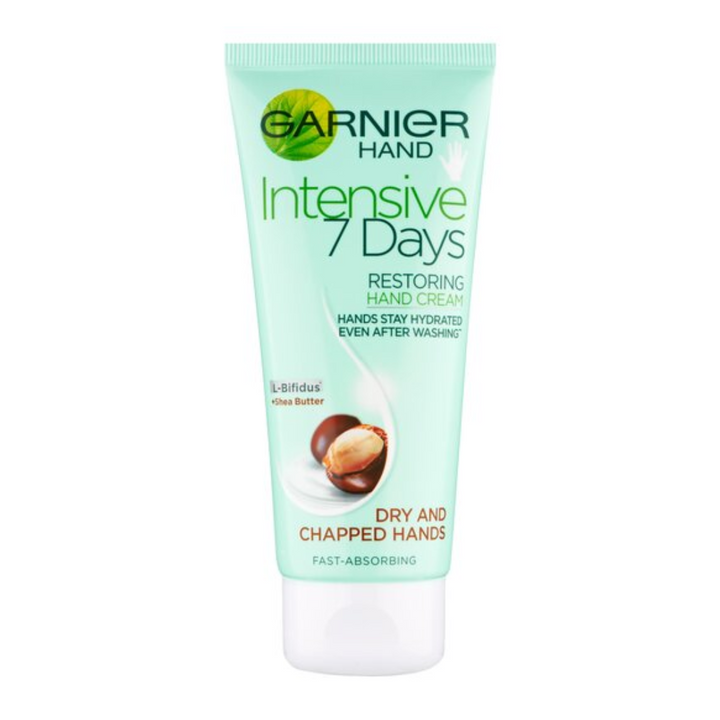 Garnier Intensive 7 Days Shea Butter Hand Cream has been developed to restore dry and chapped hands. This ultra-hydrating formula keeps hands hydrated even after washing. Enriched with shea butter, harvested from the shea tree of West Africa, and a fragment of probiotic inspired by actives found in yoghurts. This super hydrating hand cream helps to reinforce skin's natural protective barrier to maintain hydration levels in skin. It is rich in essential nutrients known to build skin lipids, helping to replenish and soften extra dry skin. Garnier's restoring hand cream is fast-absorbing, non-greasy and non-sticky.
