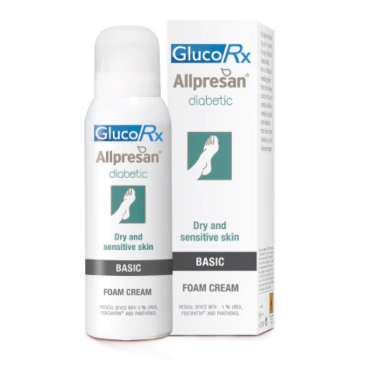 Allpresan® diabetic Foam Cream INTENSIVE is a medical device for the specific treatment of very dry to chapped foot skin in patients with diabetes mellitus. Its special properties also make it suitable for the treatment of wound edges. GlucoRx Allpresan® diabetic Foam Cream INTENSIVE promotes the healing process and supports recovery of the damaged skin barrier.
