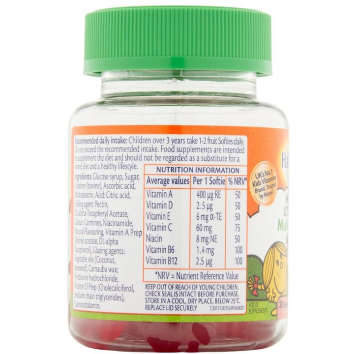 Haliborange Mr. Men little Miss multivitamins strawberry 30 Softies help provide a balanced multivitamin for everyday support. Each yummy strawberry fruit softie contains 8 essential vitamins including vitamin A, C, and D which are recommended by the UK Dept. Of Health. Vitamin A helps to support normal vision. Vitamin C helps to support the immune system. Vitamin D essential for normal growth and development of bones in children. Vitamin B12 contributes to normal red blood cell formation.