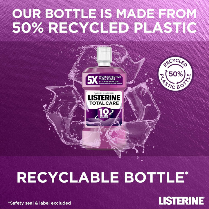 Maintain a clean and healthy mouth with Listerine Total Care Antibacterial Mouthwash. Designed to kill up to 99% of plaque and bad breath-causing germs, the mouthwash leaves breath fresh for up to 24 hours after use (when used twice daily). The oral care rinse features 10-in-1 benefits;