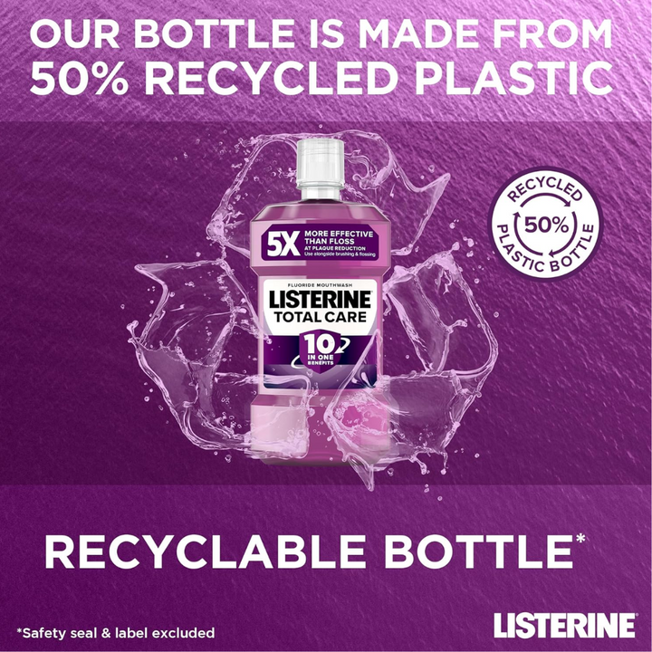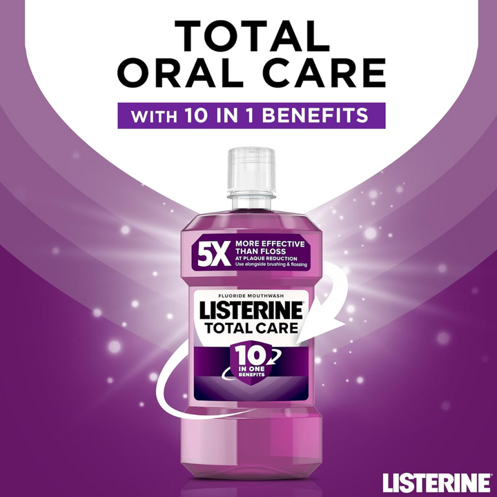 Maintain a clean and healthy mouth with Listerine Total Care Antibacterial Mouthwash. Designed to kill up to 99% of plaque and bad breath-causing germs, the mouthwash leaves breath fresh for up to 24 hours after use (when used twice daily). The oral care rinse features 10-in-1 benefits;
