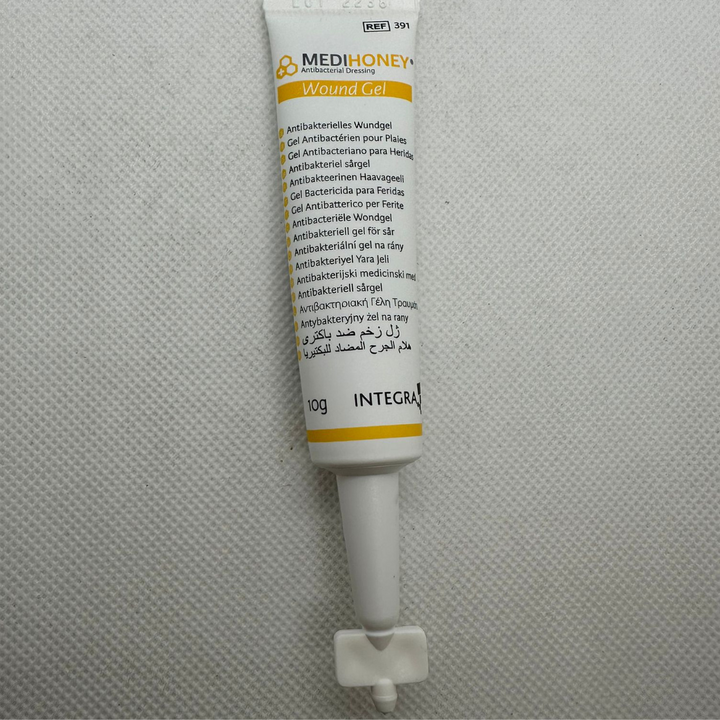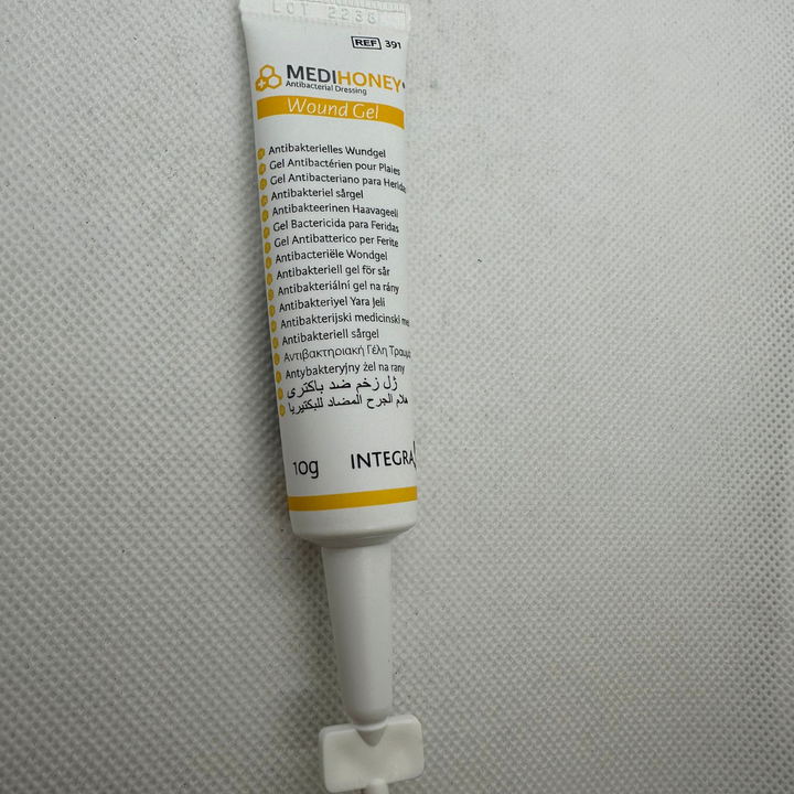 - Protect the area around the wound with Medihoney Barrier Cream. Apply approximately a 3mm thin lay of Medihoney Wound Gel at the base of the wound. Apply a thicker layer if wound fluid (exudate) is present. Avoid touching the nose to the wound.