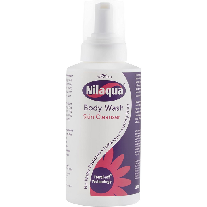 A gentle cleanser providing essential daily care with dignity. Delicate soap fragrance; the towel off skin cleansing foam effectively cleans skin, leaving you fresh and odour free without using any water. Can also be used with warm water for heavy soiling effectively cleaning the dirt, grease, odours and soiling after incontinence episodes. Paraben free and pH balanced to be mild and non-irritating to the skin. Dispensed via foam these luxury cleansers are much more user friendly and manageable for patient care. Nilaqua leaves skin fresh, soft and odour free. Unlike pressurized containers requiring emollients. The foaming application is NHS approved and lasts considerably longer than soaps and gels and thus enhances value for money. Just apply to body, massage and towel dry to remove. Ideal for bed bound cleansing.
