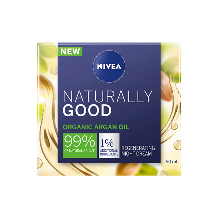 NIVEA Naturally Good Organic Argan Oil Regenerating Night Cream is a night cream with organic argan oil as well as precious jojoba and almond oils helps the skin to regenerate itself during the night, leaving skin supple the next morning. The formula hydrates and nourishes skin deeply while smoothing it. The Naturally Good range cares for both the skin and respects the planet through responsible sourcing of ingredients, minimising pollution and waste. No hidden ingredients and completely free from parabens, mineral oils and silicones.