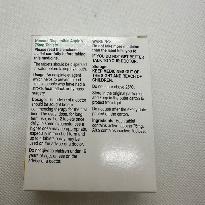 Indication: Dispersible Asprin Tablets belong to a group of medicines called non-steroidal anti-inflammatory drugs (NSAIDs). It prevents blood cells, or platelets, from producing thromboxane. It is this substance that can cause platelets to clump together and start off the process of blood clotting. This can be dangerous, as it could cause a blockage that cuts off the blood supply to an organ. A blockage in the arteries supplying blood to the heart or brain can cause a heart attack or stroke. People with angina, or who have already suffered a heart attack or stroke, are at risk of having another because of the atherosclerosis in their arteries and in this case, low dose aspirin is used to lower the risk of this. This dose of aspirin is not for pain relief. Dosage: Adults: The usual dose for long-term use is 1-2 tablets (75-150mg) once daily. In some circumstances a higher dose may be appropriate, especially in the short-term, and up to 4 tablets (300mg) a day may be used on the advice of a doctor. These tablets should be dissolved or mixed with water before taking with or after food. Swallow the tablets immediately after dispersing them in water. |