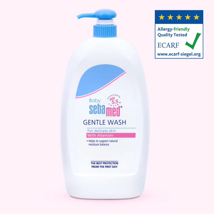 100% soap and alkali free, Sebamed Baby Gentle Wash is an extremely mild cleansing agent protecting delicate baby skin against dryness. Allantoin makes the skin soft and smooth and its pH 5.5 value of healthy skin supports the development and stabilization of the skin’s natural protective acid mantle. Suitable for cleansing from birth, Sebamed Baby Gentle Wash has a no tears formula, high skin tolerability and has no colour additives.