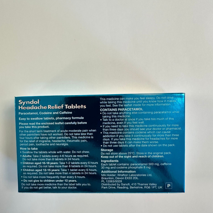 Syndol headache relief has been designed for the short term treatment of acute moderate pain when other painkillers have not worked. Do not take less than four hours after taking other painkillers. This medicine is for the relief of migraine, headache, rheumatic pain, period pain, toothache and neuralgia. Category: Analgesics |
